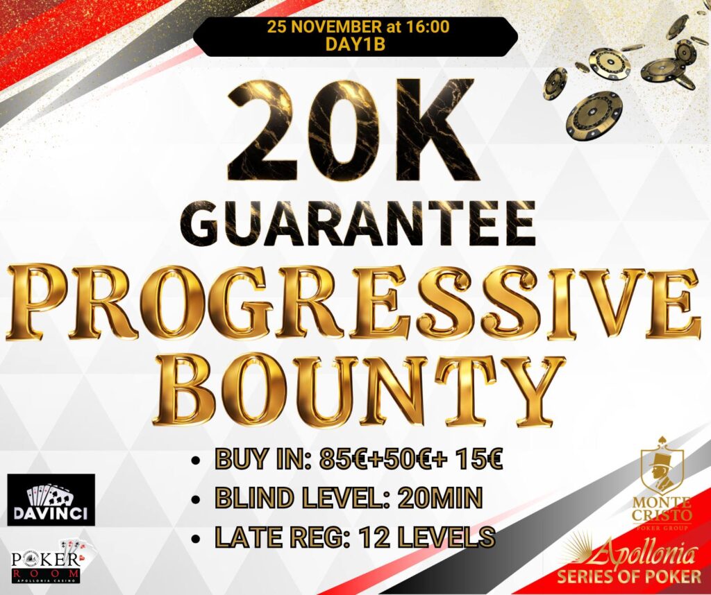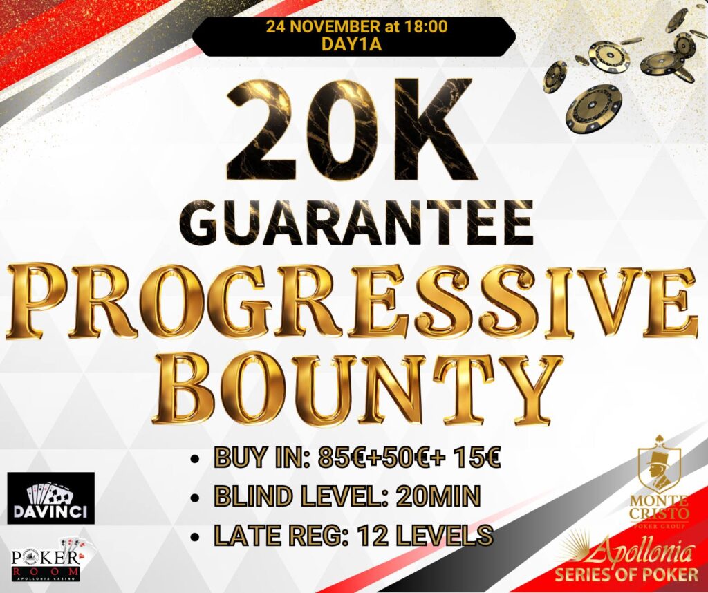 • 18:00 – Progressive Bounty (Day 1A) | Buy-in: €85 + €50+€15 – GTD: €20,000 – Blinds: 20’-Starting stack:40.000 – Late Reg: 12 levels – Unlimited re-entries