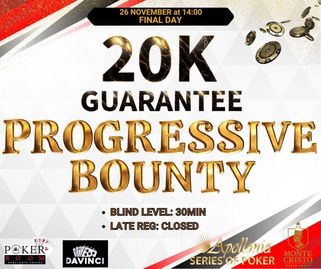 • 14:00 – Progressive Bounty (Final Day) 20.000€ GTD Blinds: 30’ – Late Reg: Closed
