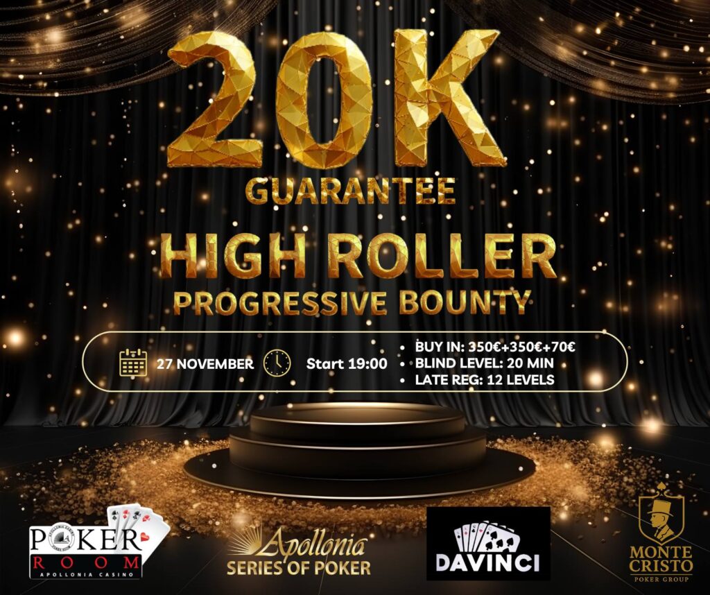 • 19:00 – High Roller Progressive Bounty 20.000€ GTD – Buy-in: €350 + €350+€70, Blinds: 20’ Starting stack 60.000 – Late Reg: 12 levels.