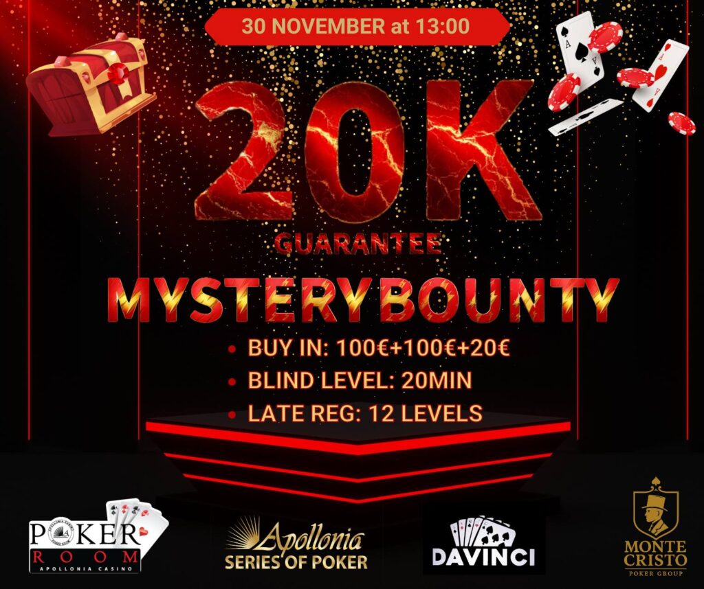 • 13:00–Mystery Bounty – Buy-in: €100 + €100 + €20 – GTD: €20.000 – Stack: 50.000 Blinds: 20’ – Late Reg: 12 levels.