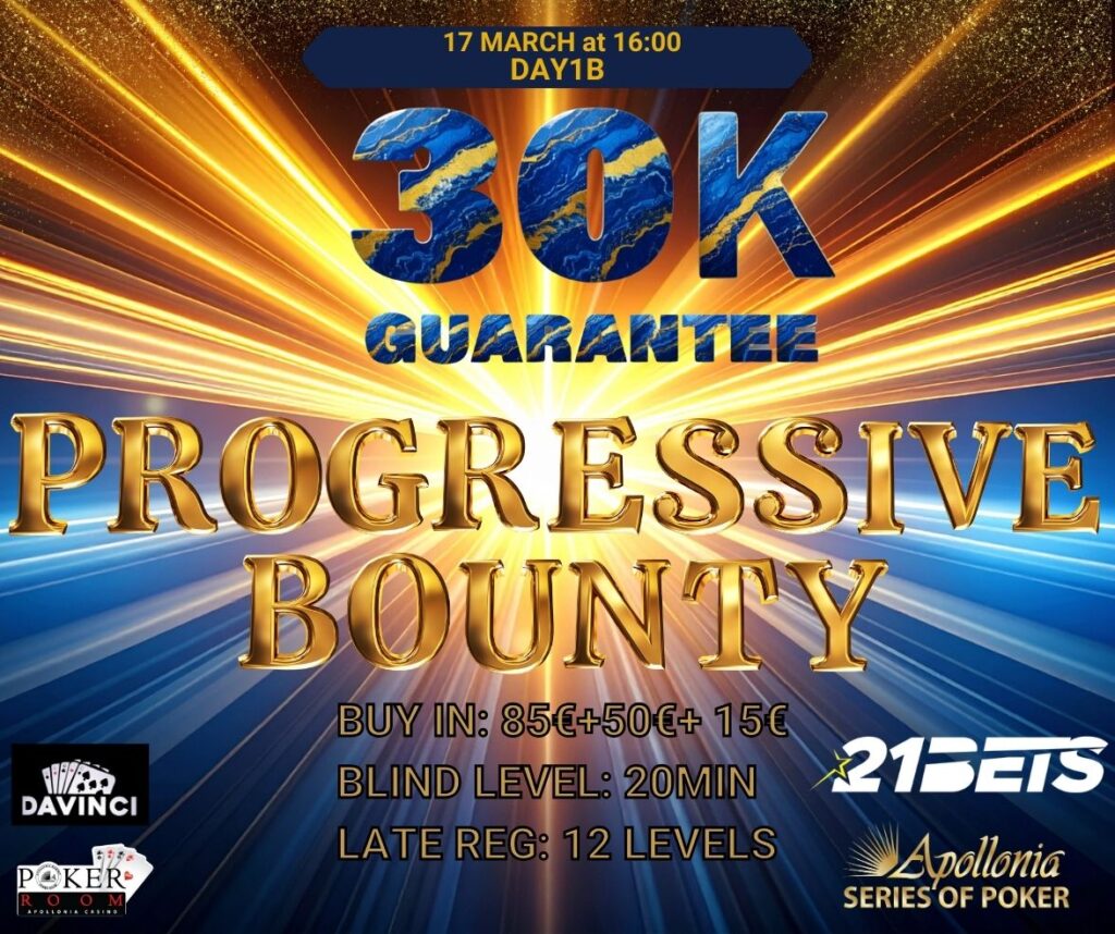 Buy-in: €85 + €50 + €15 – GTD: €30,000 – Blinds: 20’ – Late Reg: 12 levels – Unlimited re-entries