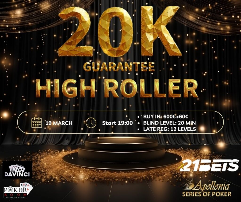 €20,000 GTD – Buy-in: €600 + €60 – Blinds: 20’ – Starting stack 100,000 – Late Reg: 12 levels
